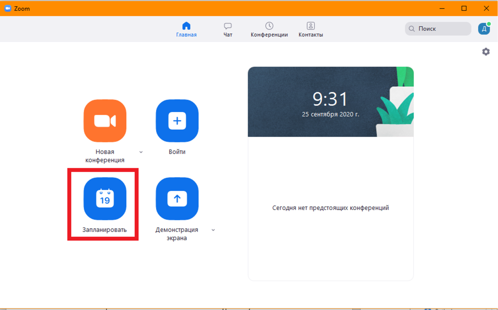 Откройте ваш клиент Zoom, войдите в систему и нажмите на значок «Запланировать»
