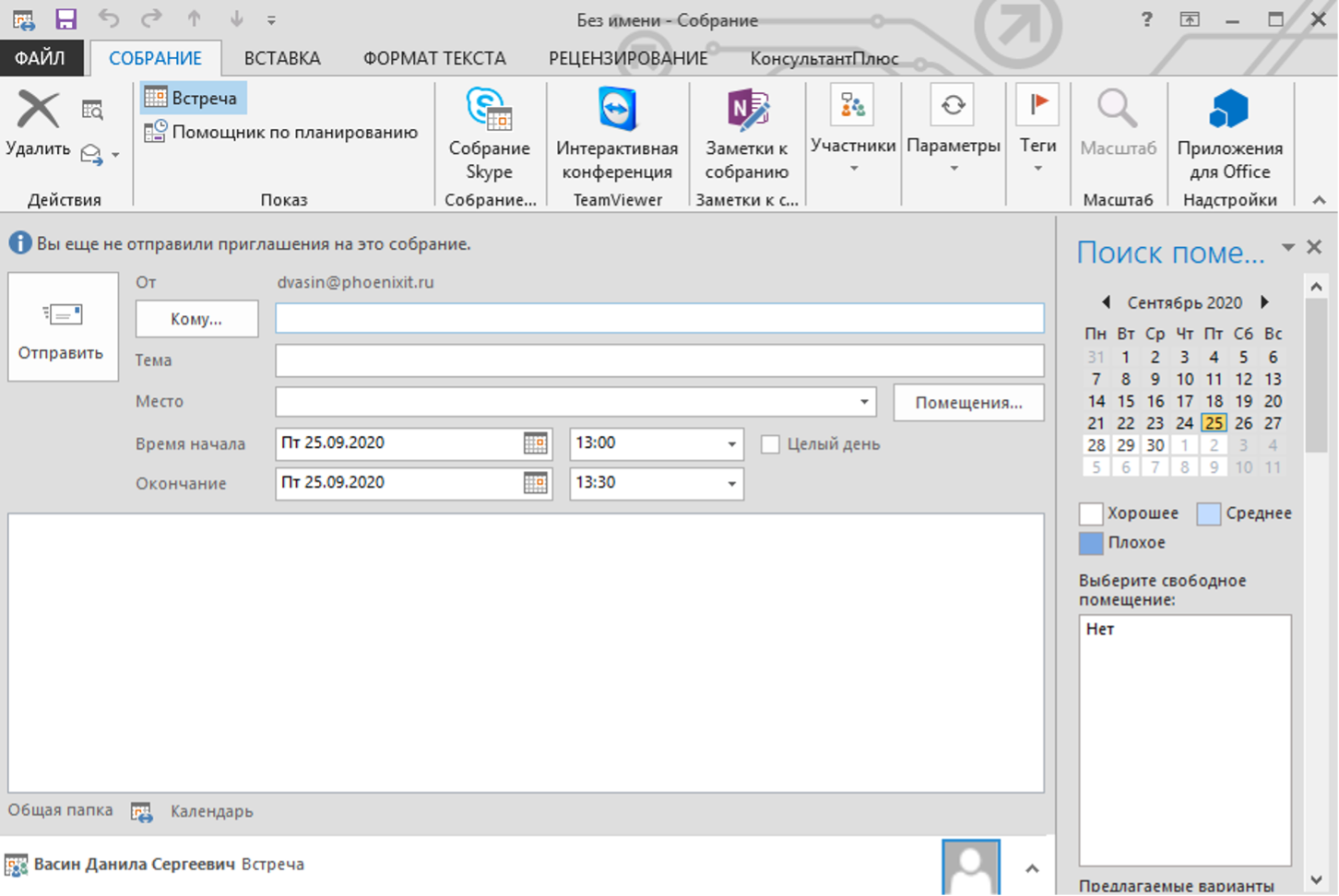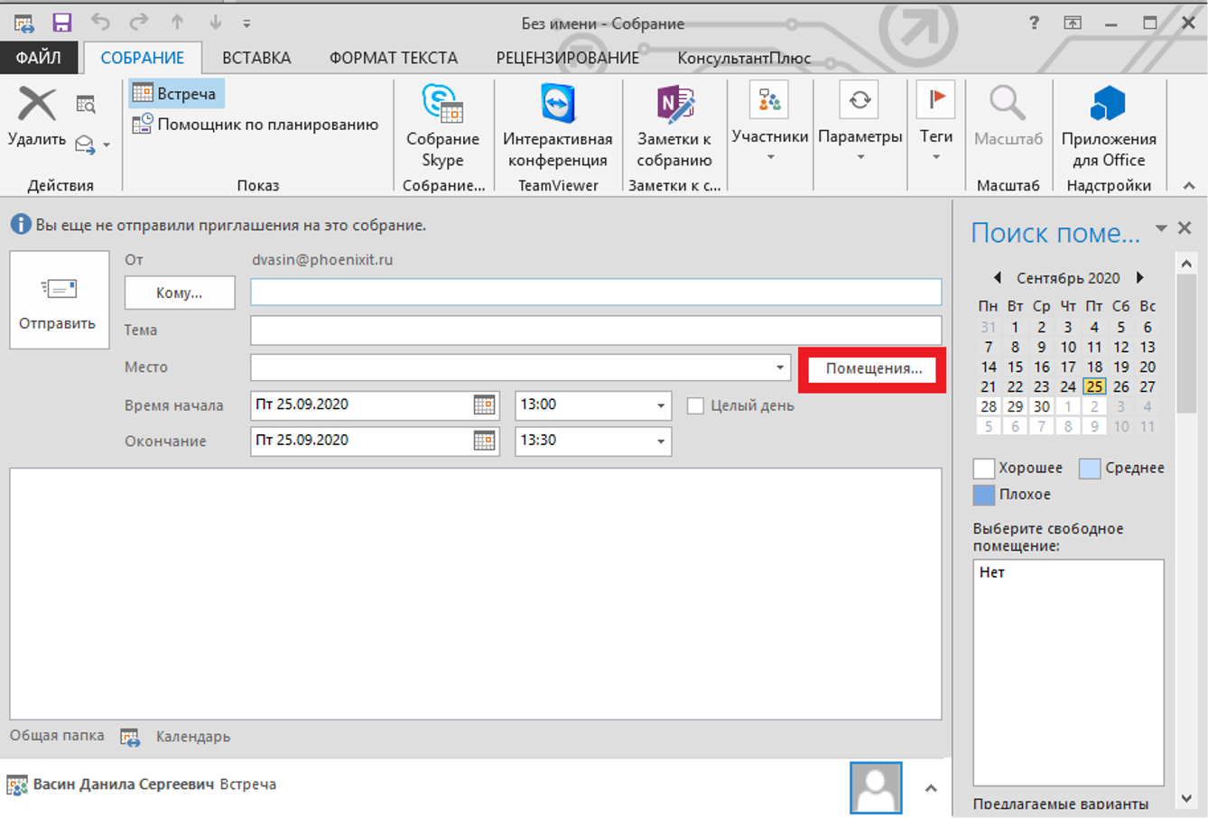 Если конференция занята на выбранное время, Outlook сообщит об этом, выберите любую другую. После заполнения всех полей и выбора конференции нажмите кнопку «Отправить»