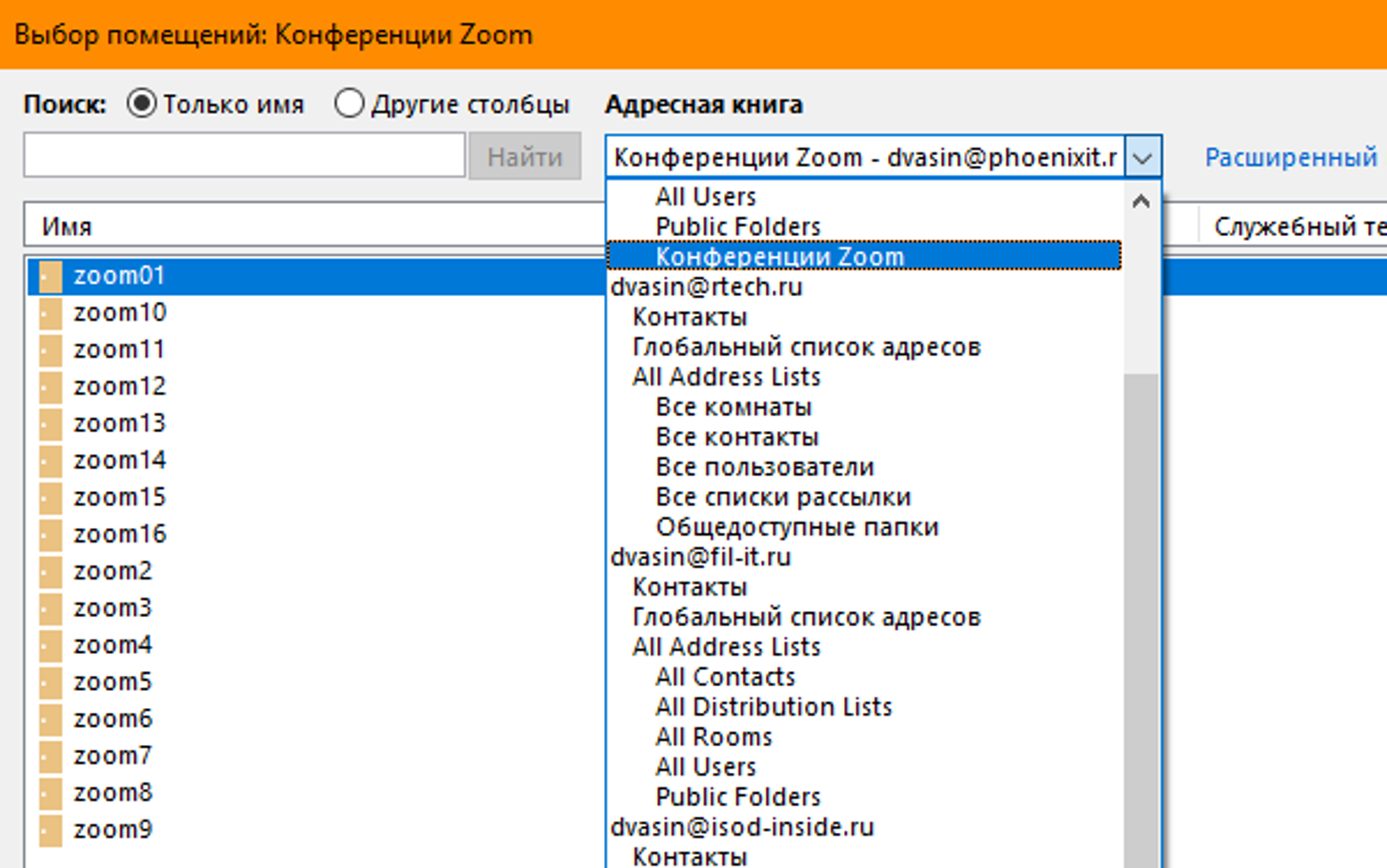 В открывшемся окне выберите адресный лист «Конференции Zoom» и в этом списке выберите любую комнату